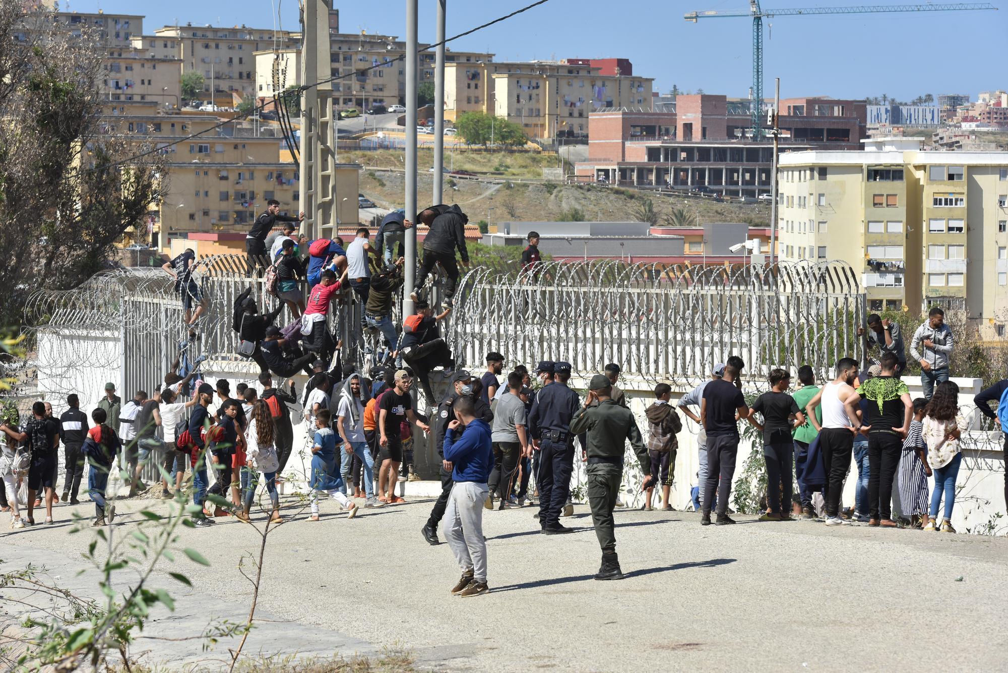 2021年5月18日,人们从摩洛哥翻越边界围栏试图进入西班牙飞地休达。新华社发西班牙国民警卫队在一份声明中说:“这是一个狭窄的地道,用木头加固,可能用于在摩洛哥和西班牙之间运输毒品。”